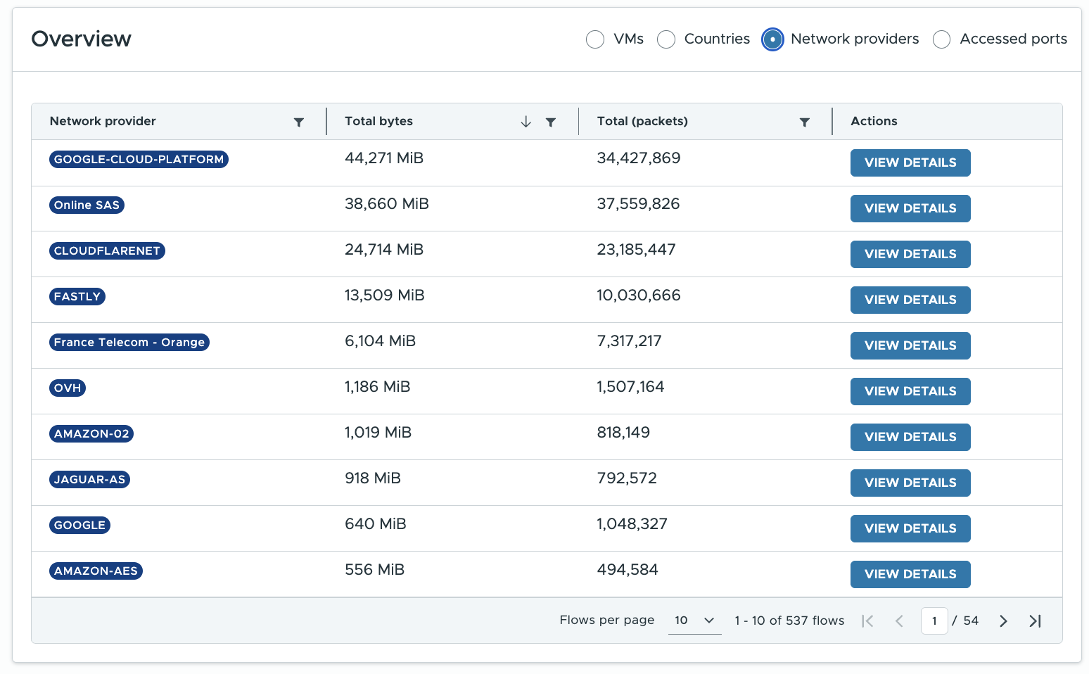It shows the network provider from which outside flows come, first showing those who have the highest traffic. In a context of a cloud project, this component can be useful to find VMs that are connected to the cloud project.