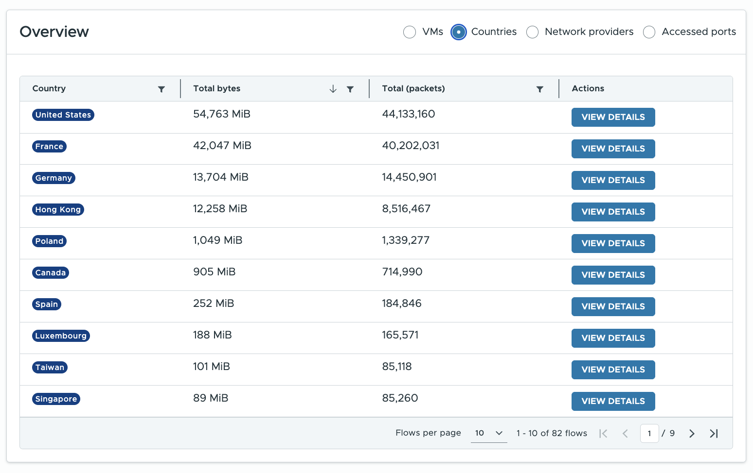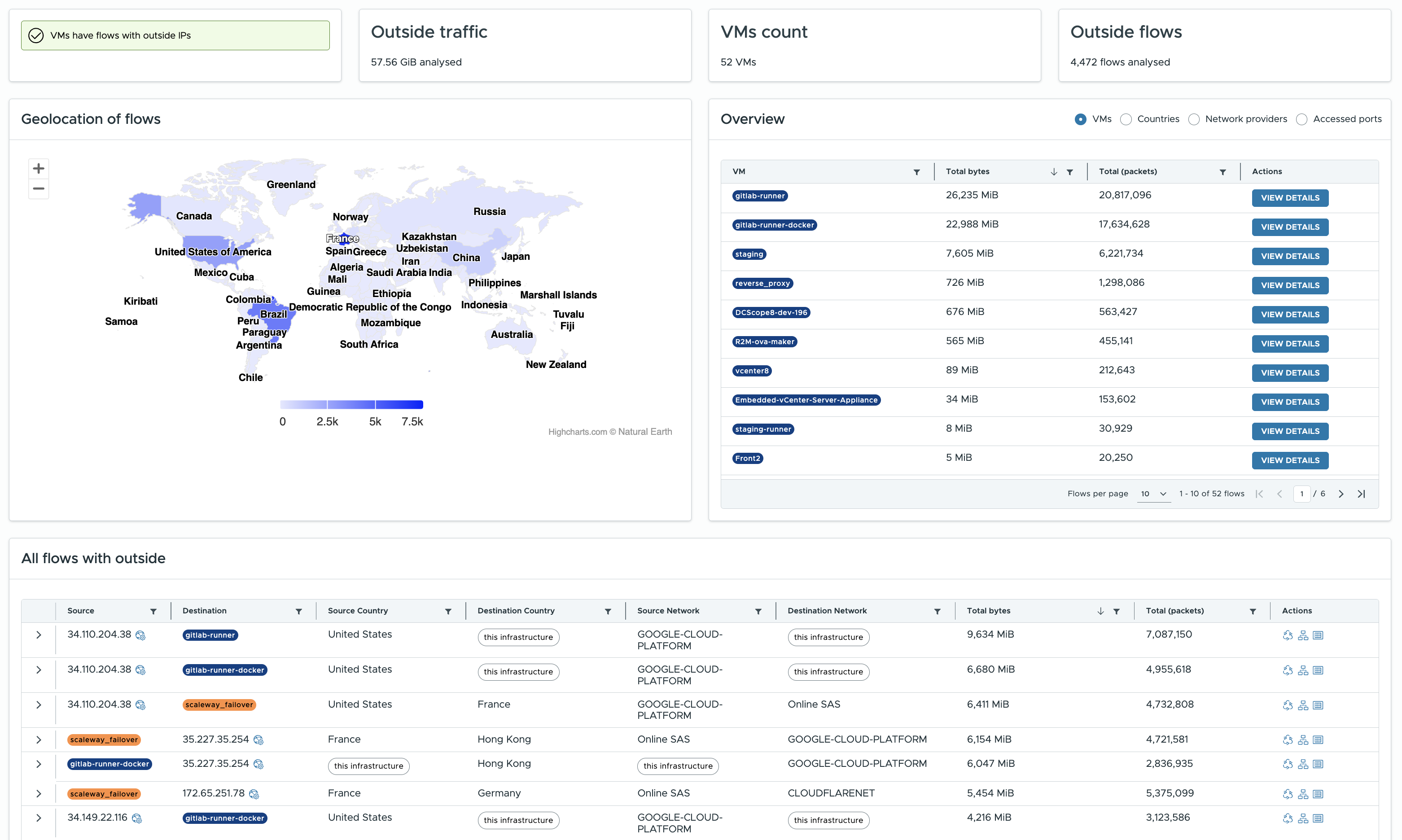 This component focuses on netflow flows with resources located outside the infrastructure (i.e. IPs located on Internet). It provides a quick view of the origin countries of flows, their ASN (Autonomous System Number, i.e. the network provider), and which VMs has communications with outside.